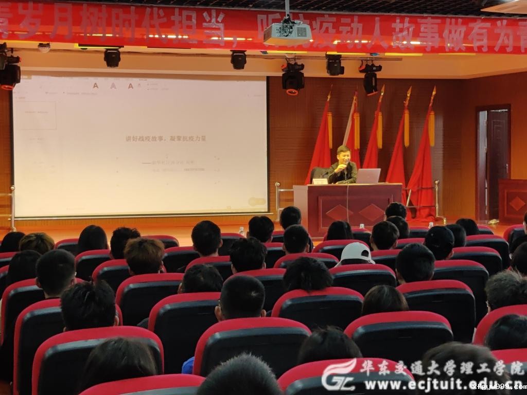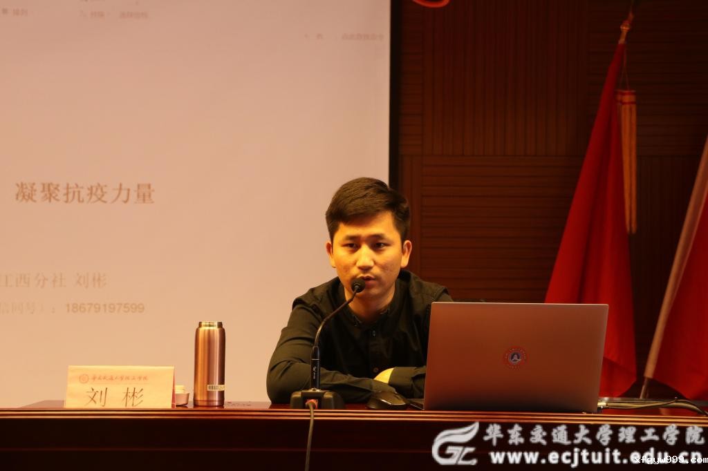 宣讲伊始,刘彬与全场人员展开互动,针对在社会主义行政力量下国家与人民所做出的努力进行交流,并就当代中国与全球的关系进行深度解读,引导学生增强民族自豪感,提升民族凝聚力。他强调,此次战“疫”背后的胜利离不开中国特色社会主义现代化下的人民所具备的凝聚力、号召力。他讲述道:“疫情初始,便毅然决然向单位领导主动请战奔赴武汉支援。疫情席卷速度太快,江西紧急响应中央号召进行封城举措,此次支援之行只得放弃。立马回到工作岗位投入战斗,为国家抗击疫情献上自己的一份力量。身边所熟悉的朋友能在第一时间支援的都请战出征,毫无畏惧。”他用影片展示了这个时代的英雄形象。所谓英雄就是“为民请命不能避,为国赴难不能避,临危受命不能避。”他表示,疫情之下,全民皆兵,党员同志更是临危受命,带头冲在“防疫”一线,这无不体现着中国特色社会主义道路自信和制度优势。最后,他一再强调,当代中国青年应当传递青春力量,坚定制度自信。
