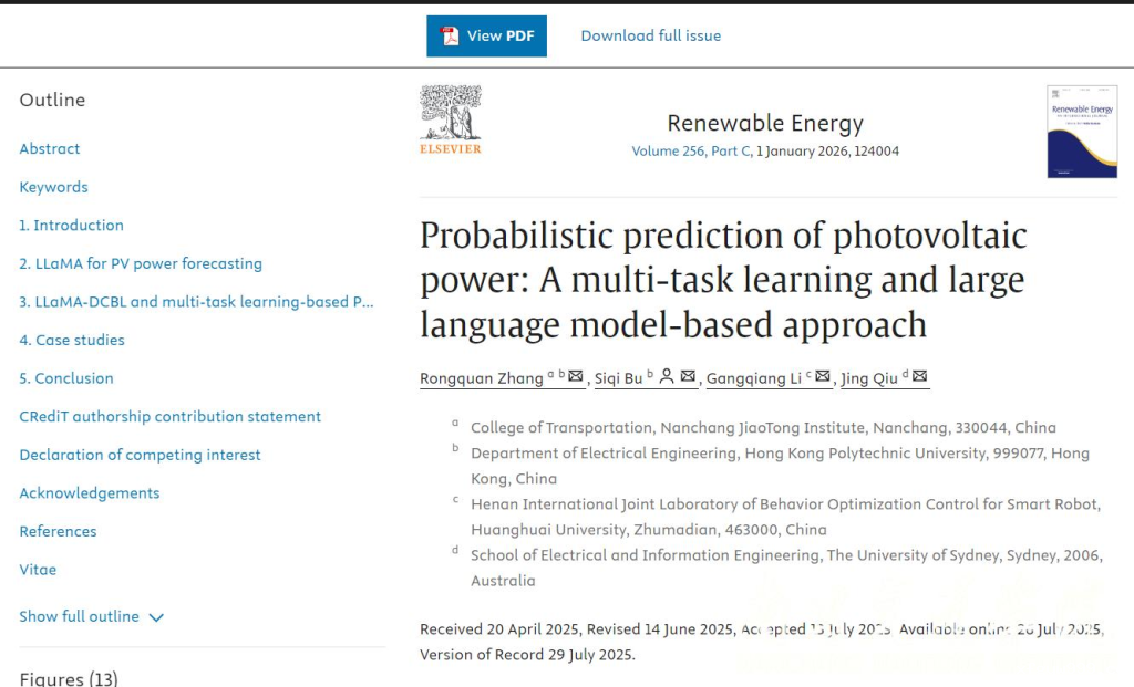 (科研处 许应祥报道)近日,我校交通运输学院张荣权老师在能源领域TOP期刊Renewable Energy(影响因子9.1,中科院SCI期刊分区1区)上发表了题目为“Probabilistic prediction of photovoltaic power: A multi-task learning and large language model-based approach”的研究成果。这是我校首次以第一署名单位在此期刊上发表文章。