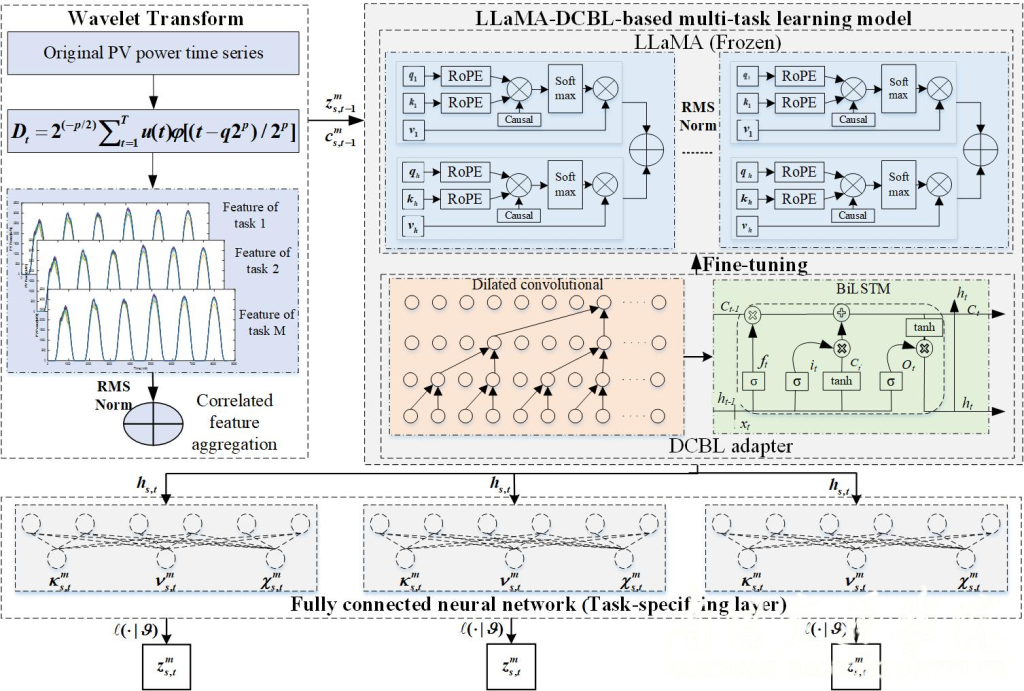 准确的光伏发电功率中长期概率预测对于优化发电计划和实现双碳目标具有重要价值。然而,目前光伏发电功率预测的研究主要侧重于短期预测,对于中长期概率预测的研究则相对不足,尤其是在数据可用性有限的情况下。因此,本研究提出基于多任务学习与大语言模型的中期光伏功率概率预测方法,取得四项创新突破:一是构建融合小波时频分析、多任务学习框架与LLaMA架构的新型预测模型,填补了大语言模型在光伏功率预测领域的研究空白;二是开发基于空洞卷积双向门控网络的适配器机制,解决了LLaMA模型在时序概率预测中的微调技术难题;三是提出LLaMA-DCBL概率预测框架,实现了光伏功率的中期概率预测方法创新;四是实证研究验证了所提方法在零/少样本场景下的预测性能显著优于DeepSeekR1等21种现有前沿方法。