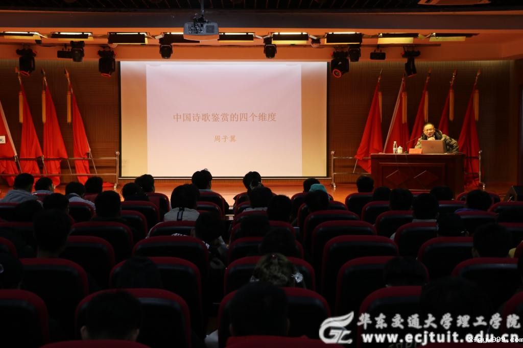 (学工处 闵淑琴报道 学生会 邹碧云摄影)为传承和弘扬中华优秀传统文化,提升我校师生的文学素养和文化情操,12月17日下午,我校特邀中国韵文学会常务理事、江西古代文学学会副会长、南昌大学期刊社副社长、南昌大学古籍整理研究所所长、文学博士周子翼走进黄家湖讲坛作《中国诗歌鉴赏的四个维度》专题讲座。学校学工教师、尚德班学生及各分院学生代表共700余人聆听讲座。学工处处长张国迎主持讲座。