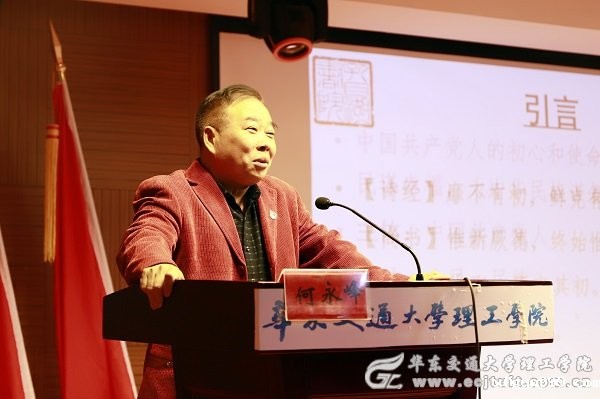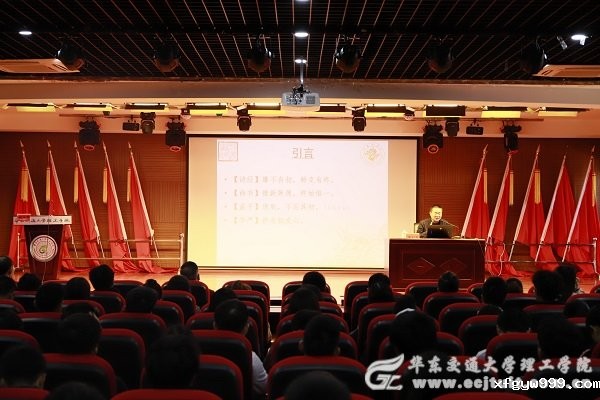 (融媒体中心 王赵丽 俞天一 廖子星报道 贡悦 摄影)11月20日下午,华东交通大学图书馆馆长、孔目湖书院院长石初军做客黄家湖讲坛,结合优秀传统文化阐述共产党人的初心与使命,为在场六百余名学生开设了一场别开生面的讲座。校党委副书记何永峰主持讲座。
