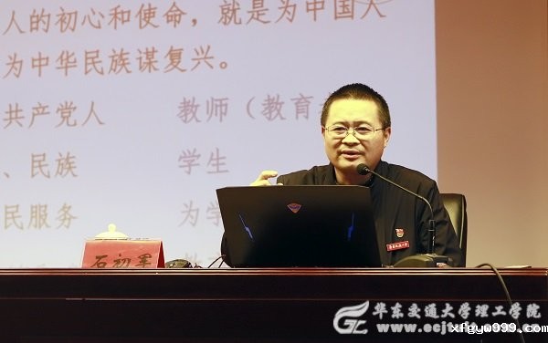 石初军用风趣幽默、通俗易懂的语言深入浅出地为大家阐释了“何为初心与使命?”“为什么不能忘?”以及“怎么做?”的三个问题。他首先解读了初心和使命的深刻内涵。“人之初,性本善”“明乎善”为初。所谓初心即为善,善的关键在无私,并从天命、民命、时命三个方面对使命进行了分析。石初军引用孟子与孔子之言指出,忘记初心就如同无源之水,无本之木,忘记使命就是忘记天命、民命、时命,让人失去方向与动力,缺乏信心与恒心。石初军还引用了大量的经典诗词,由浅入深、由表及里地阐述了如何牢记初心与使命的问题,引导学生传承传统文化,通透深意。他希望大家能沿着初心追理想,肩负使命开智慧,壹是皆以修身为本,强调修身九要(知耻、知畏、立志、好学、反省、改过、亲师、取友、磨炼),并勉励大家要不忘初心,方得始终,担当有为,不负时代。