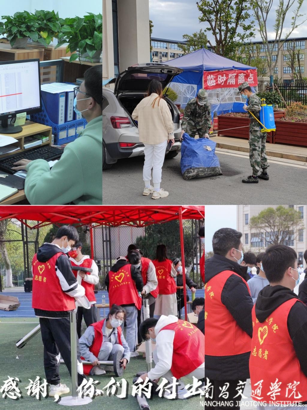 教师党员、“红马甲”青年志愿者在现场献出了自己的一份力量。“我报名、我可以、我站岗……”面对学校防疫工作,教师、学生第一时间响应。教师党员、团员青年积极报名参与到多种形式的疫情防控工作中,统计学生信息,做好学生思想教育、情绪和心理疏导工作,协调隔离宿舍,帮助学生搬运快递,进行快递消杀,食堂打饭等,他们用行动彰显使命与担当,尽己所能筑起这座疫情防护的高墙。在我校教师、防疫工作者、学生志愿者的共同努力下,完成了两校区全体师生以及工作人员的两轮核酸检测工作。