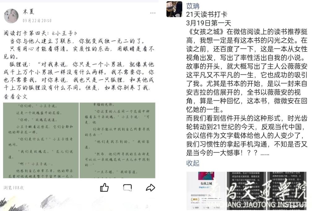 学习方面,我校开展了“书香战疫,阅读阅美”的读书打卡活动。活动发布以来,共有2076名学生参与,1408名学生完成打卡。同学们通过在社交平台上分享自己的阅读感悟,表达心声,讲述他们自己对书中人物的看法,用真情实感温暖人心。活动的开展锻炼了同学们的思考能力,提升了同学们的自我修养,丰富了同学们的精神世界。