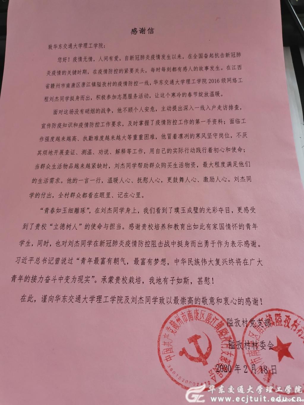 正是在疫情防控一线的出色表现,刘杰收到了赣州市南康区镇溢孜村村委会的感谢信。感谢中写到:他的一言一行,温暖人心、抚慰人心,更鼓舞人心,激励人心。刘杰同学的付出,全村的群众都看在眼里,记在心里。刘杰回应道:“很荣幸也很感谢组织能给我这次机会来贡献自己的一份绵薄之力,我希望我自己小小的举动能帮助到别人,用自己的双手为祖国贡献力量。”
