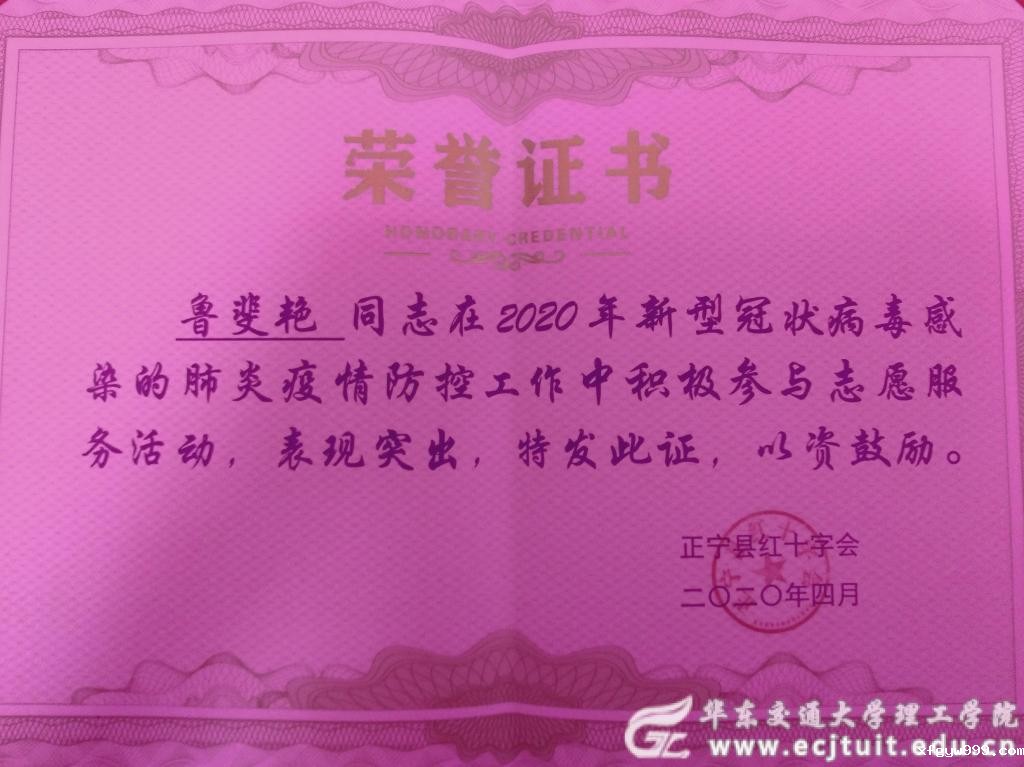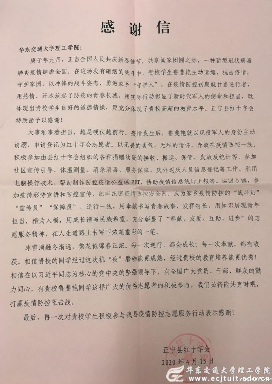 【编者按】疫情暴发,全国驰援。医生、护士、军人、社区工作者、志愿者,一个个逆行的背影让人钦佩不已。已是初夏时节,我校土建分院收到来自甘肃省庆阳市正宁县红十字会的一封感谢信。这份感谢信里又有什么故事呢?本期【战“疫”先锋】讲述土建分院入党积极分子鲁斐艳的战“疫”故事。