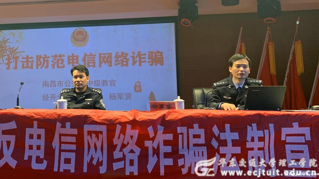 (保卫处 黄菊连摄影报道)开学季,为提高学生防范网络诈骗意识,3月16日上午,我校邀请南昌市公安局经开分局法制教官杨军贤和辖区民警吴清林来校开展防范电信网络诈骗主题宣讲会。保卫处处长李国辉主持会议,全校专兼职辅导员参加。