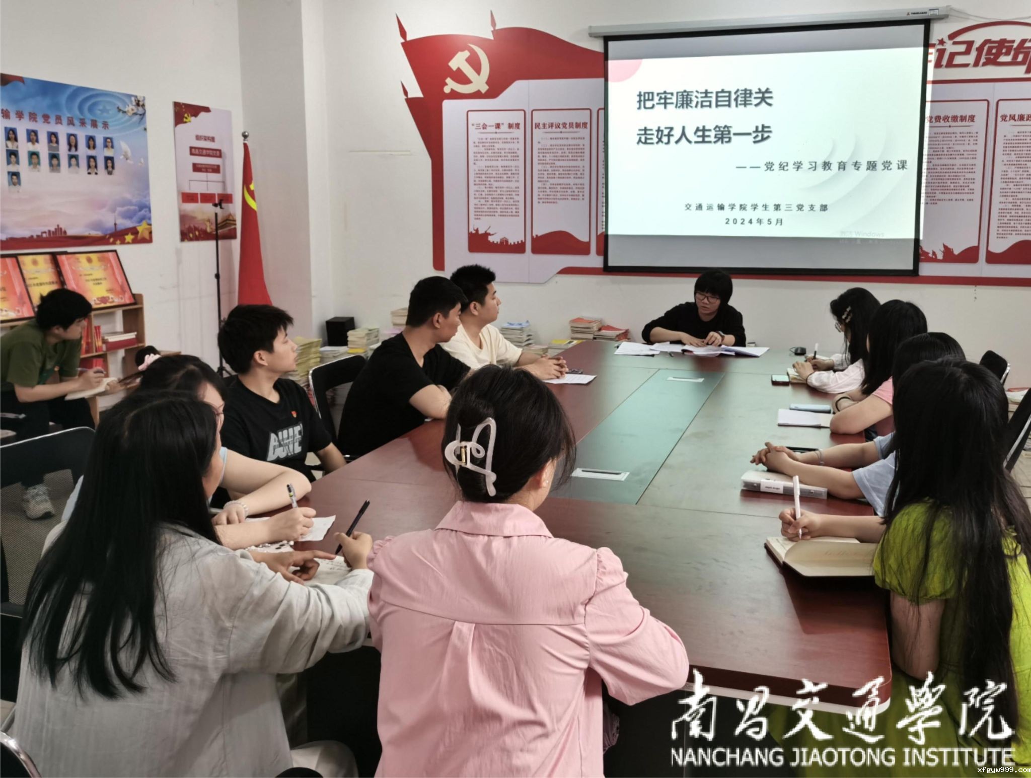 (交通运输学院 蔡丽娟报道 郭德泽摄影)在全党开展党纪学习教育、加强党的纪律建设之际,5月10日,交通运输学院学生第三党支部组织毕业生党员开展党课《把牢廉洁自律关 走好人生第一步》。党课由运输学院学生第三党支部书记蔡丽娟主讲,支部委员傅春林老师及毕业生党员参加。