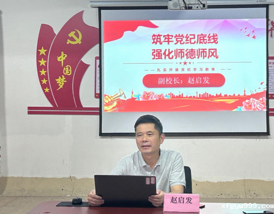赵启发重点从“强化师德师风”方面出发,为现场的老师们进行精彩讲授。他举例了近期省内外违反师德师风及党组织纪律的警示案例,并通过案例,向大家阐述了教师职业道德的核心要义和违反师德师风行为的严重后果及不良影响。他强调,全体教师党员要进一步提高政治站位,增强法纪观念,切实把师德师风建设和党纪学习教育落到实处,做到知敬畏、存戒惧、守底线。希望大家在学纪、知纪的基础上,真正做到明纪、守纪,自觉做到遵守师德师风,恪守师德行为规范。